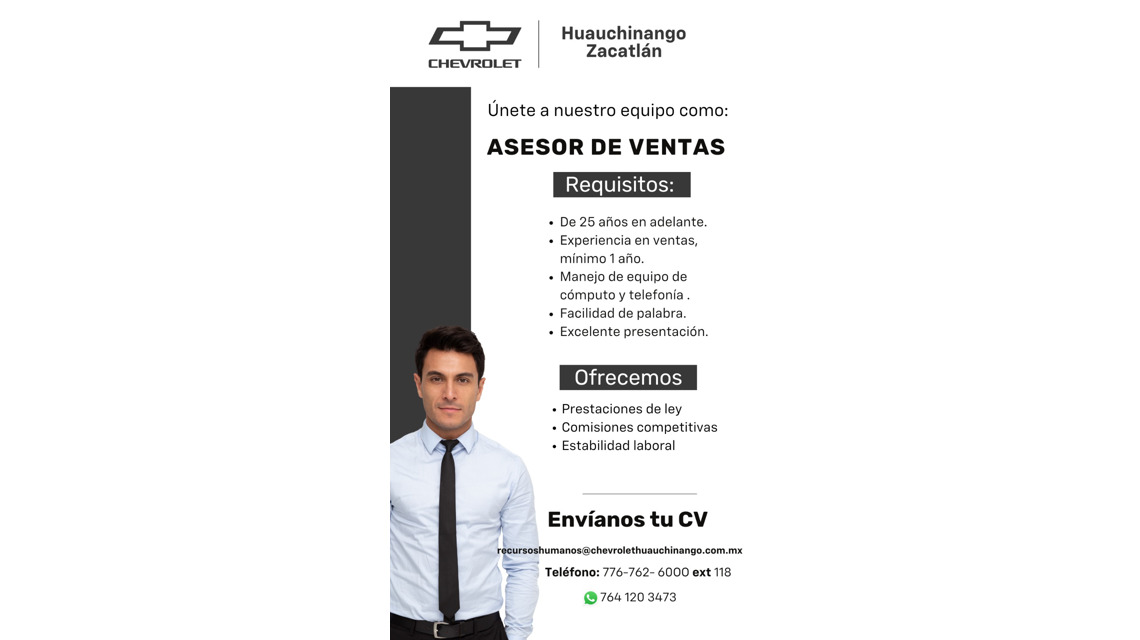 En Chevrolet Huauchinango estamos en búsqueda de un Ejecutivo de Ventas con mentalidad ganadora, enfoque en resultados y pasión por brindar una experiencia excepcional al cliente.