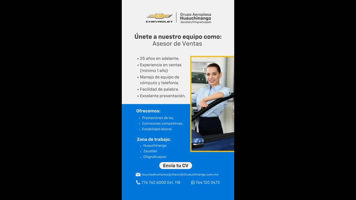 En Chevrolet Huauchinango estamos en búsqueda de un Ejecutivo de Ventas con mentalidad ganadora, enfoque en resultados y pasión por brindar una experiencia excepcional al cliente.
